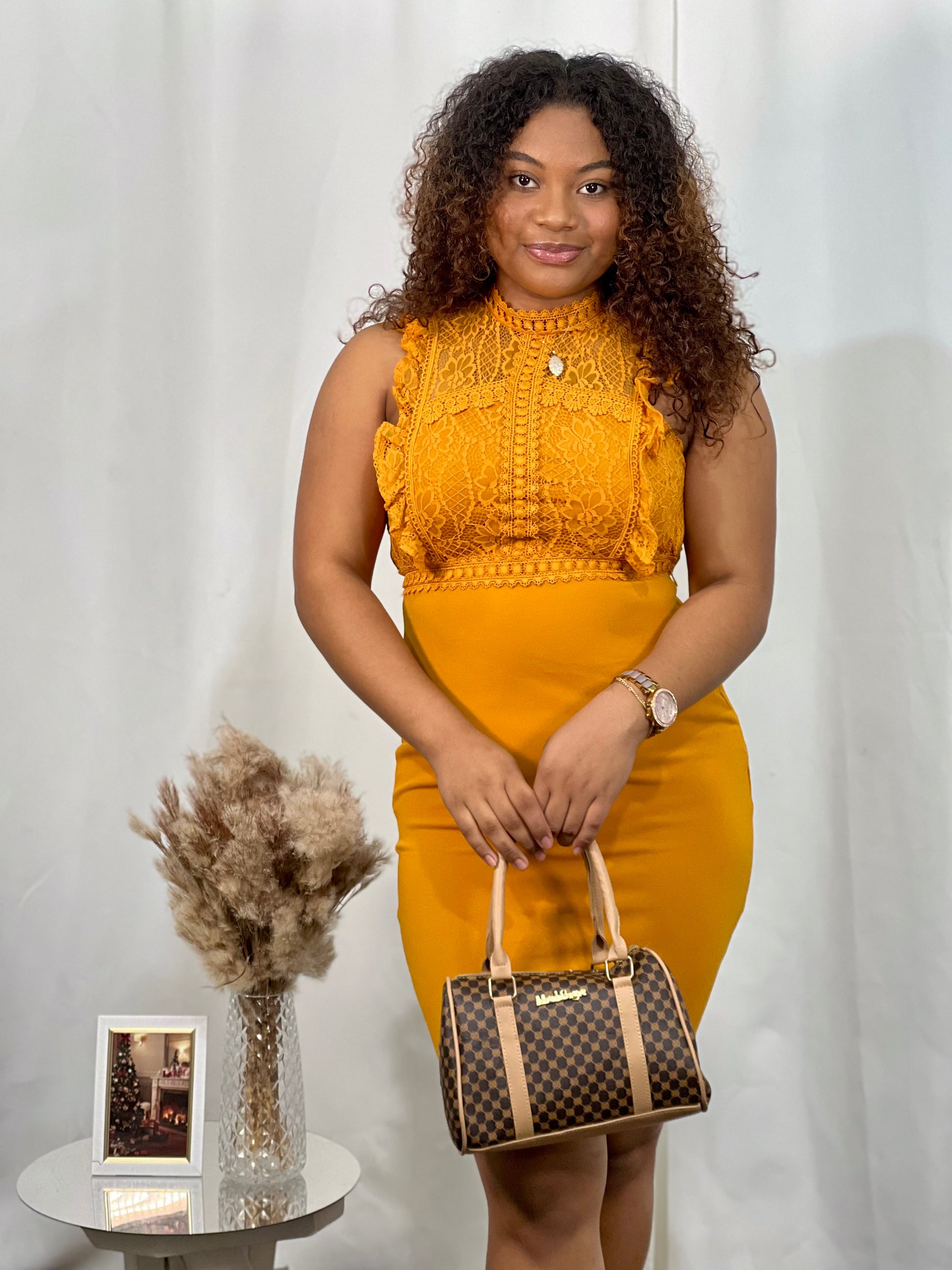 RUFFLED LACE TRIM, MOCK NECK BODYCON DRESS