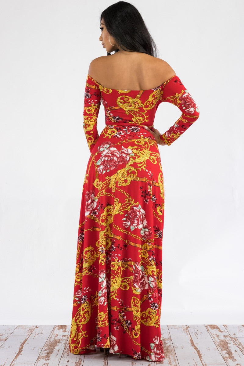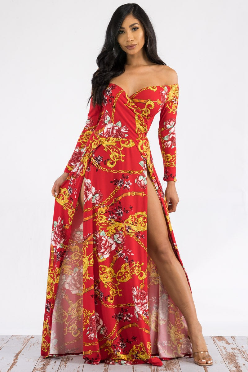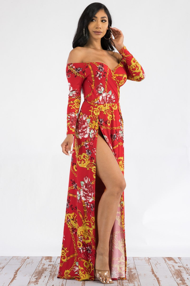CHAIN MULTI PRINT LONG SLEEVE SLIT MAXI DRESS