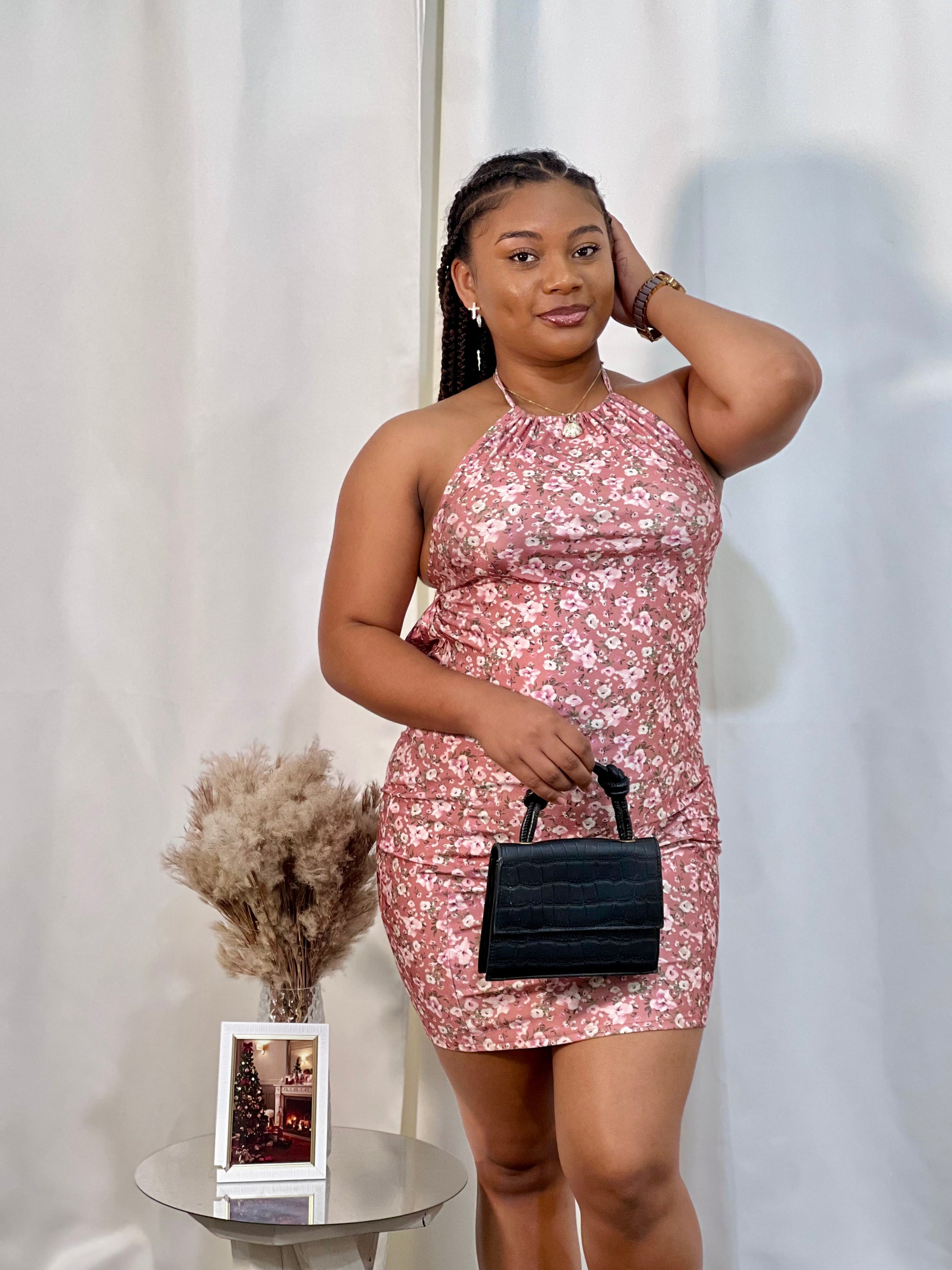 HALTER NECK, FLORAL PRINT MINI DRESS